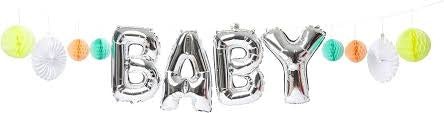 Cute silver balloon garland kit for a baby celebration featuring super shiny balloons spelling B-A-B-Y and lots of decorative honeycomb pennants.
