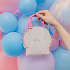 After an undersea party complete with mermaids give your little guests their goodies in these cute shell party bags. Each bag is embellished with shiny silver foil and ribbon tassels. They are finished with coral red, twisted paper handles.