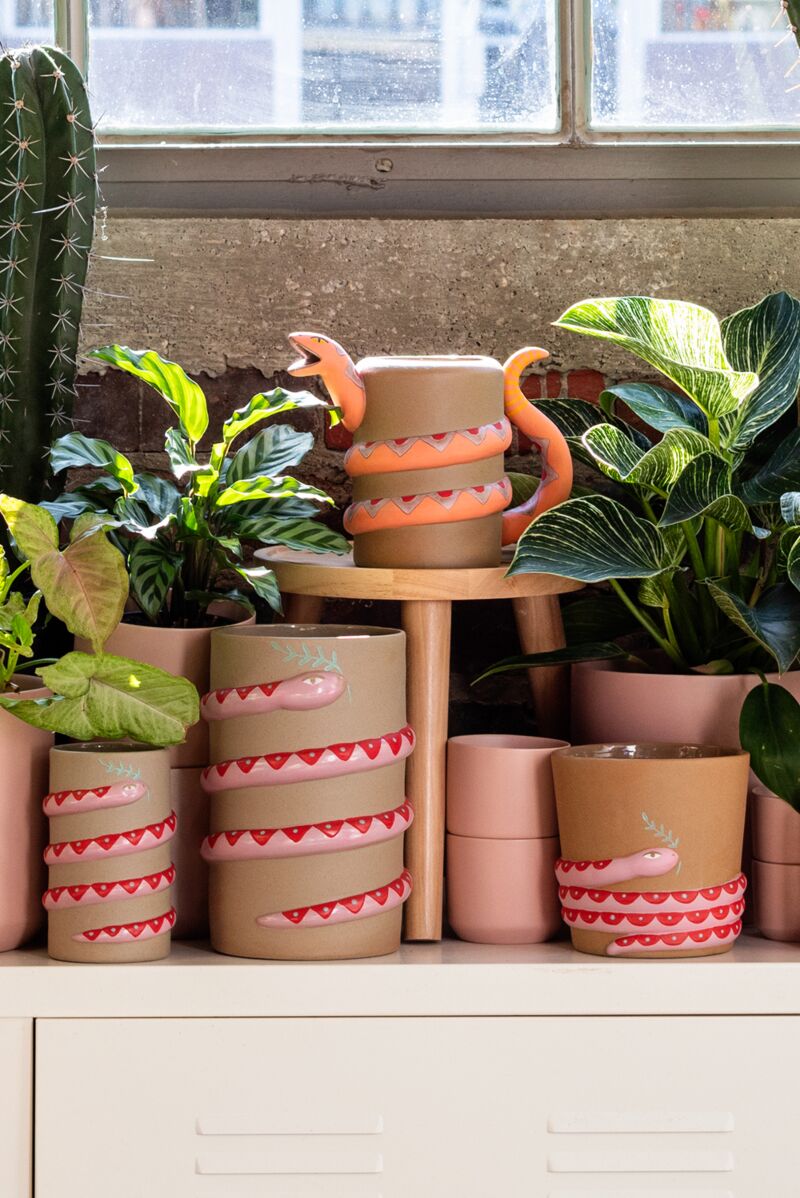 The Serpent Collection is playful and chic in equal measure, with a coiled snake in pretty shades of pink wrapped around a bisque clay backdrop.