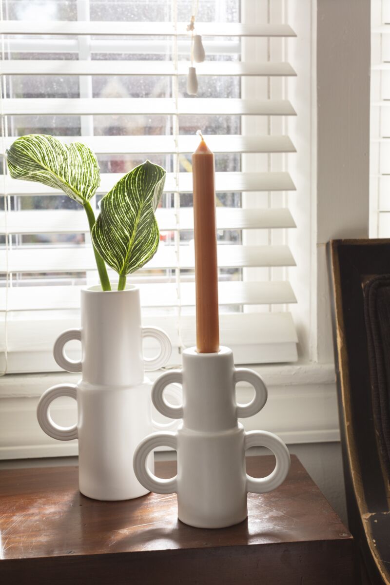 Designed to perfectly hold a standard taper candle, the Slateford Candleholder features unique loops on either side and a smooth white finish.
